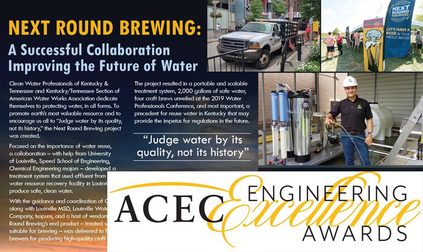 As described in the release from ACEC's national headquarters in Washington, D.C., Next Round Brewing was formed to inspire and promote dialogue regarding the value of the nation’s most precious resource and the importance of water reuse. The program’s accomplishments included the development of a portable and scalable system to treat wastewater treatment effluent using existing water treatment technology and provide 2,000 gallons of safe, high-quality water suitable for four Louisville breweries to create high-quality craft beers.